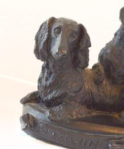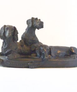 This elegant, bronze figurine features three Dachshund dogs: a Short-Haired Dachshund, a Wire-Haired Dachshund, and a Long-Haired Dachshund. Each one is reclining in a slightly different pose on a bronze base..