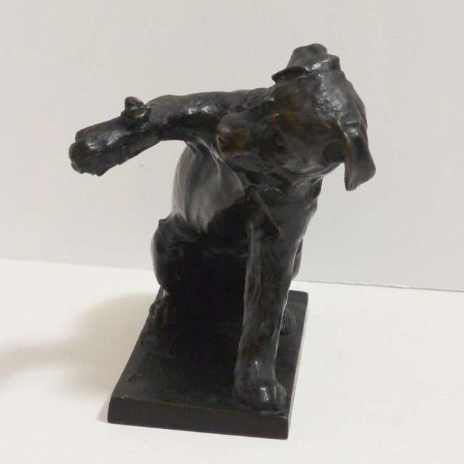 This rare and wonderful sculpture is cast in bronze and patinated deep brown. It captures the inquisitive nature of a puppy dog, who finds that a bee has landed on his leg, and he raises his leg to get a better look at it.