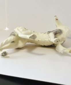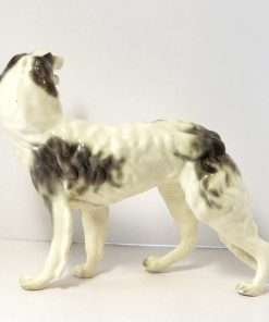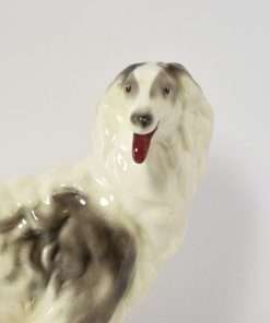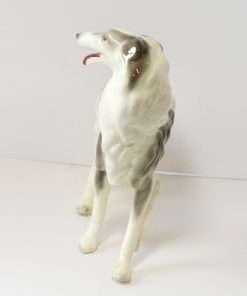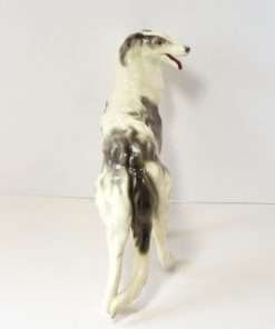 This Borzoi’s soft grey coloring against a bright white coat, makes her a real stand out. Her tri-color eyes and open mouth, showing teeth and a long red tongue, really adds tremendous personality to this vintage dog figurine.