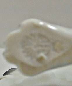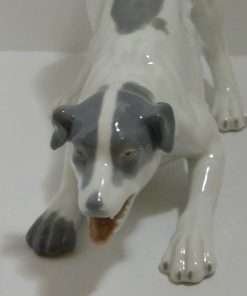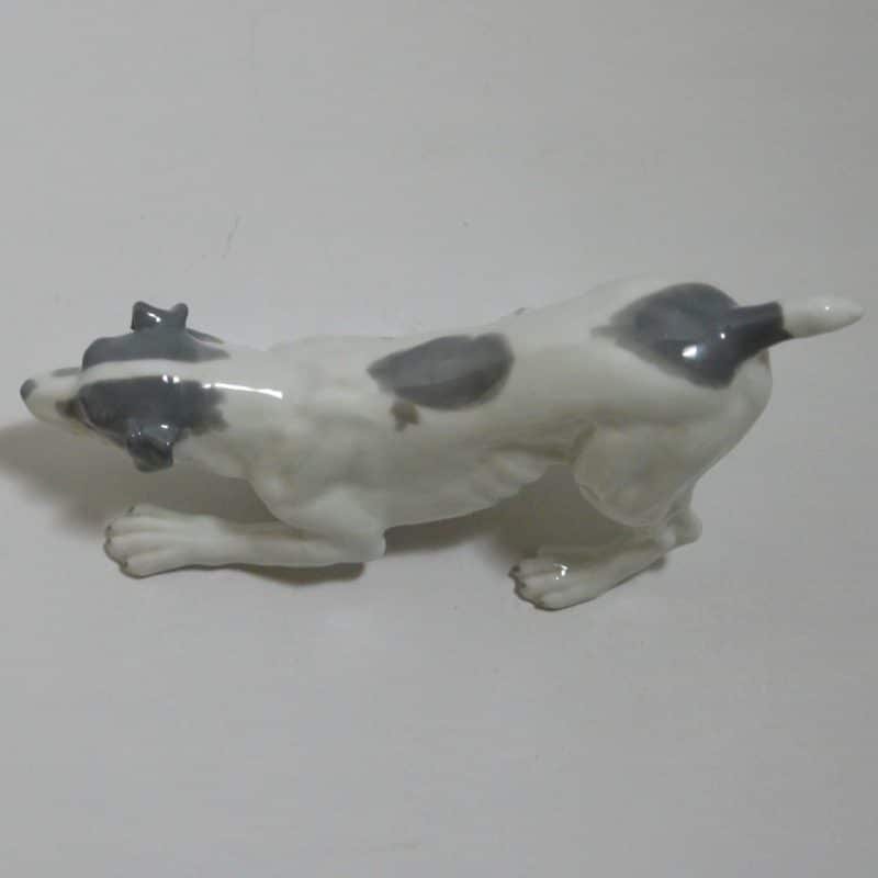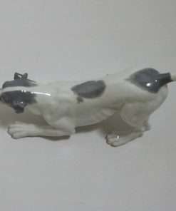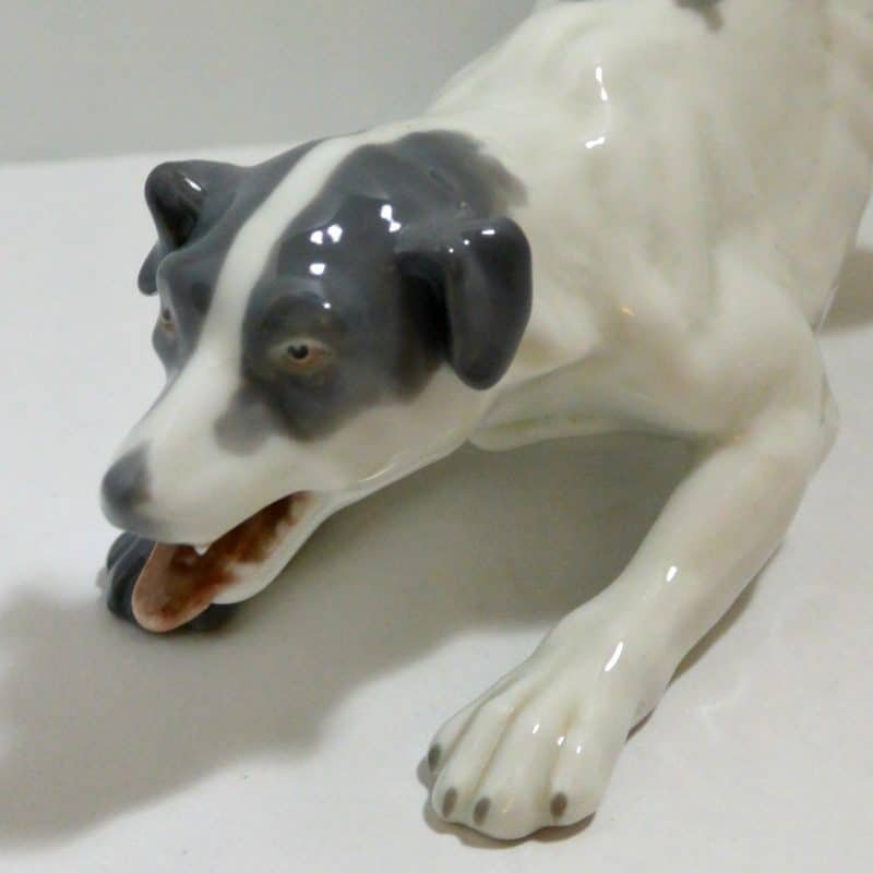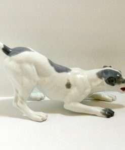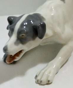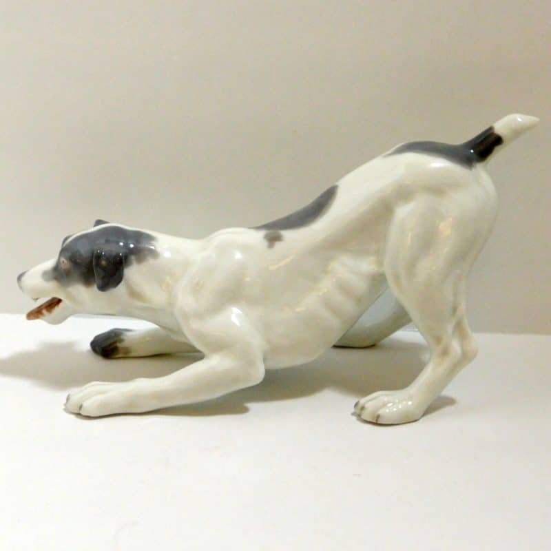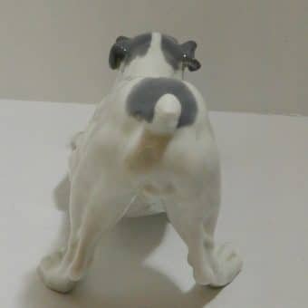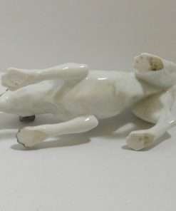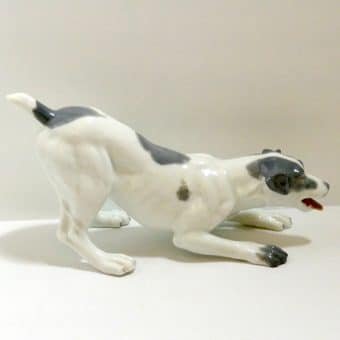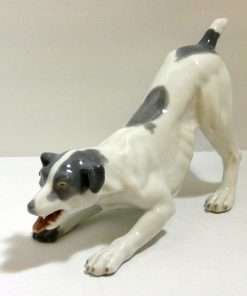 Created by Gebruder Heubach, the well-known dollmakers of Thuringia Germany, this porcelain terrier looks ready to pounce and play! The exquisite detailing includes an open almost “smiling” mouth with an extended tongue and even two small canine teeth. Standing 4 1/2″ tall x 8 1/2″ long x 3 1/2″ wide, he is done in a snowy white with soft grey markings, black eyes ,a rosy tongue, and a beautiful, high-gloss finish.