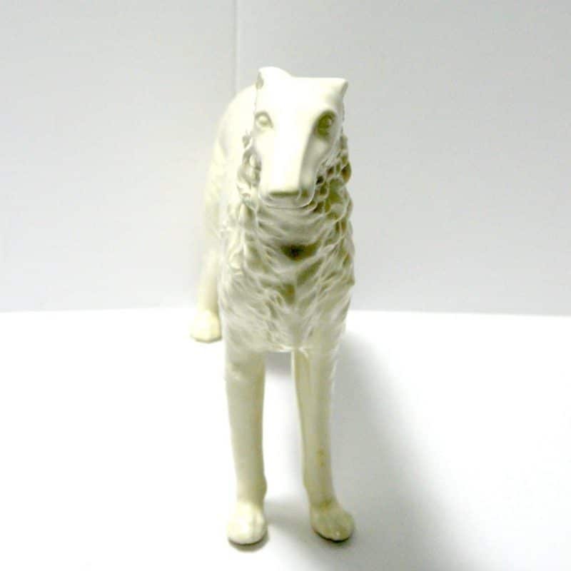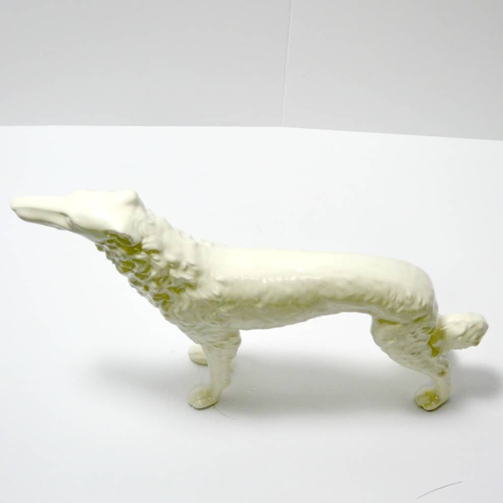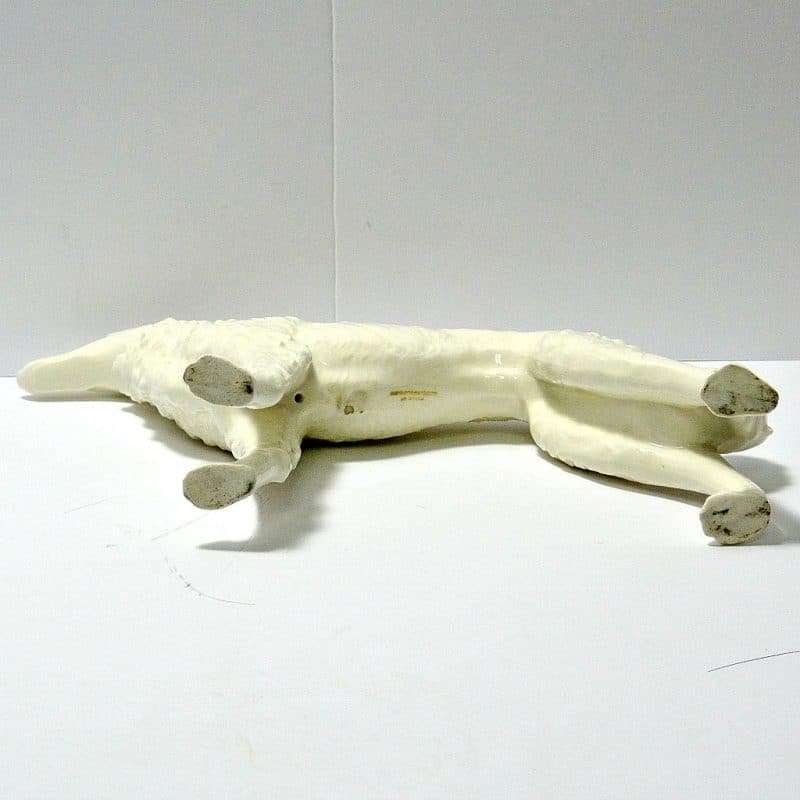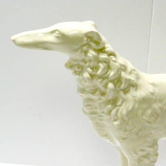 This large, porcelain Borzoi figurine was made in Czechoslovakia c.1940. It measures a full 9″ tall x 13″ long x 2″ wide. It is in excellent condition, and it is stamped “Made in Czechoslovakia” on it’s underside.