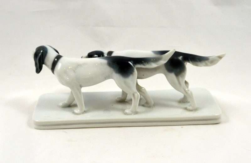 This dog figurine is wonderful for so many reasons! First it is a rare Metzler Ortloff, c. 1950’s. It is in excellent condition. It depicts, a matched, exquisite pair of Pointer dogs, and it is black and white!