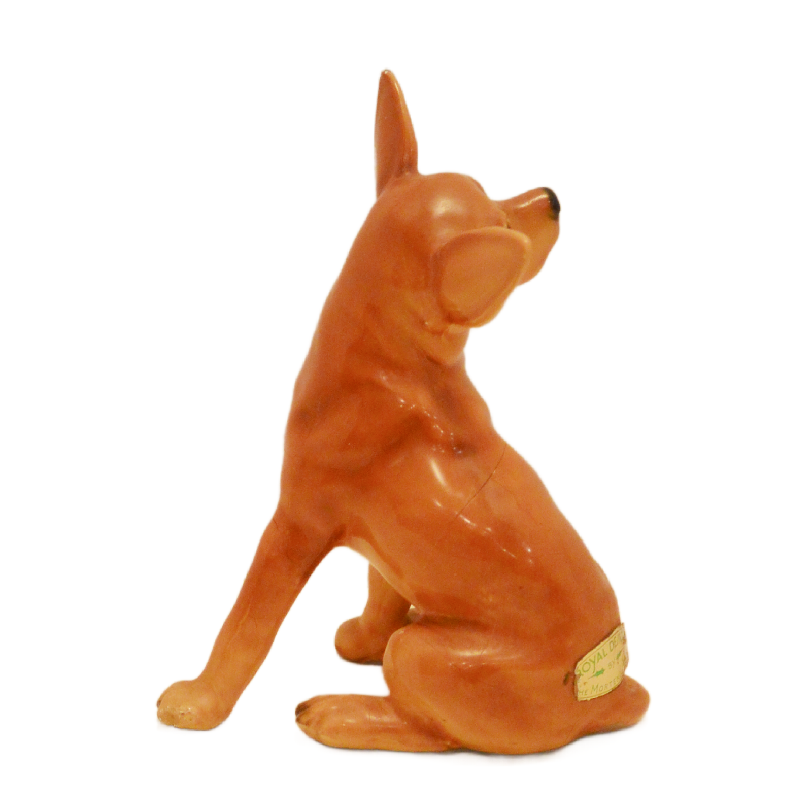 Sculpted in Chicago during the 1940s, the piece features the studio’s signature “Durostone” ceramic-over-wire technique. The warm tan glaze and alert, hand-painted eyes give it a lifelike presence that modern mass-produced figurines simply can’t replicate.