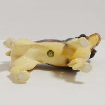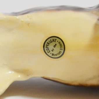 The designer of this figurine, Oscar Morten, immigrated from Sweden to the U.S. and opened a giftware studio in Chicago in 1931. Over the next 32 years, he created over 300 popular dog and horse models. Composed of ceramic over a metal skeleton, these figurines, although beautiful and engaging, were prone to crazing and flaking, thus making it difficult, today, to find examples in perfect condition.