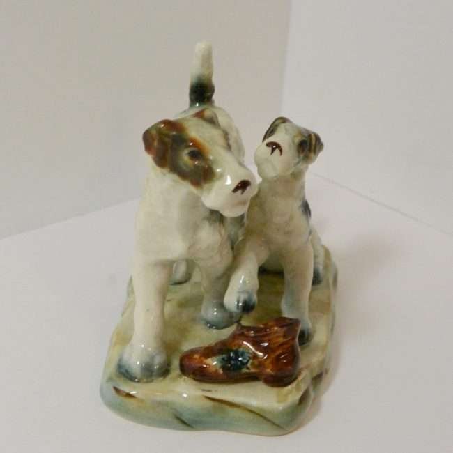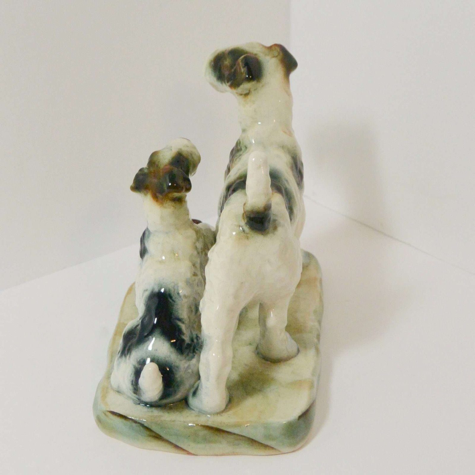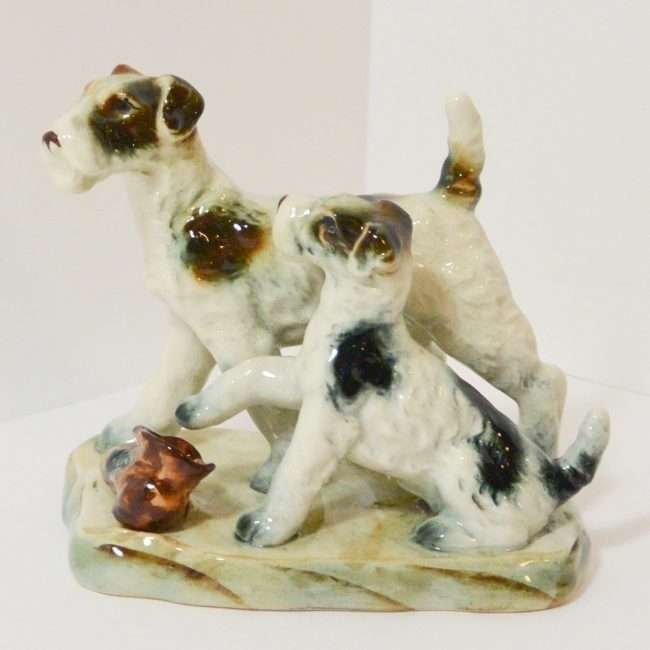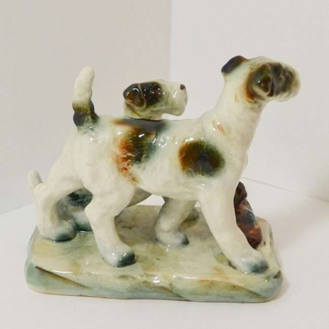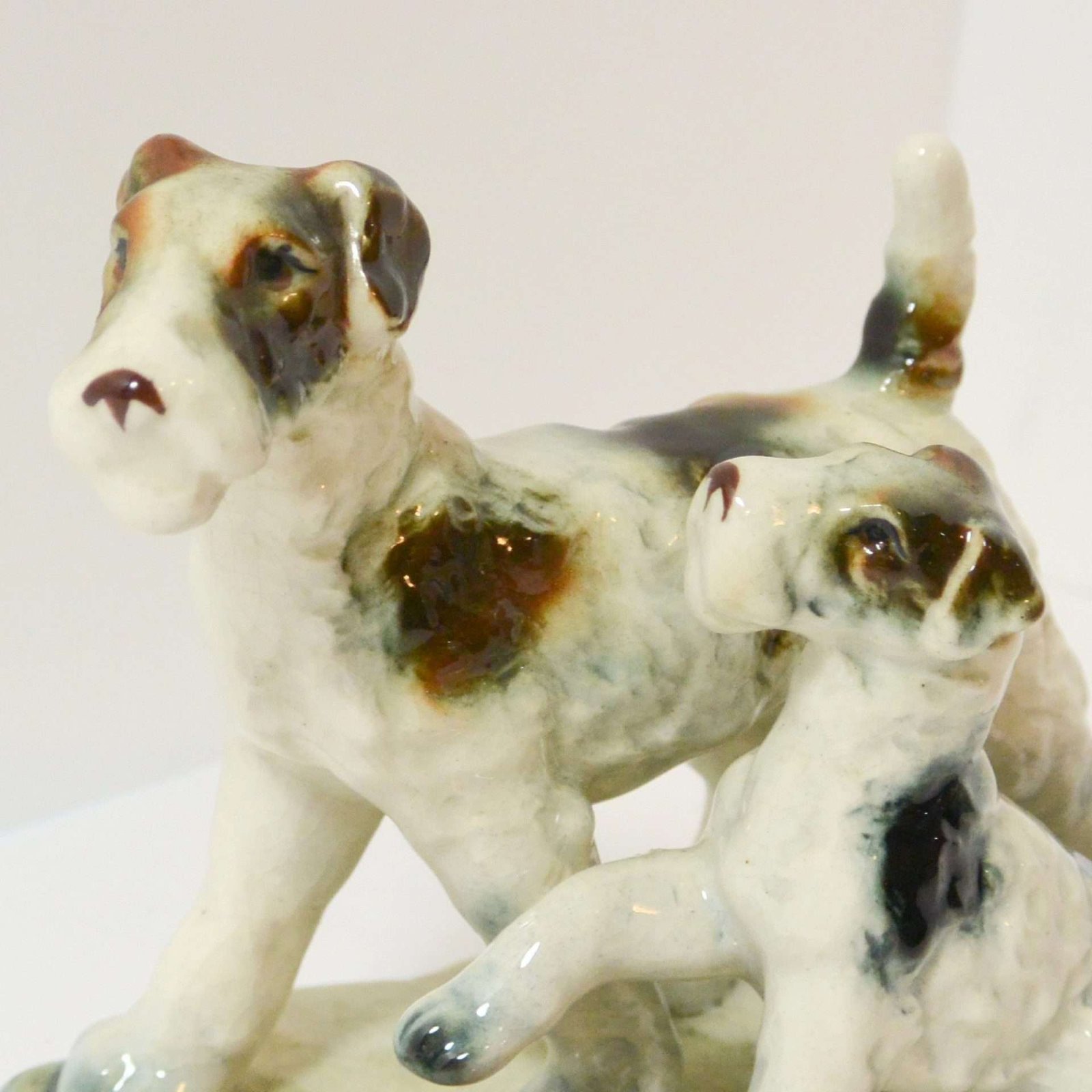 This beautifully-detailed, vintage dog figurine consists of an adult Fox Terrier dog and a Fox Terrier puppy.
