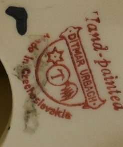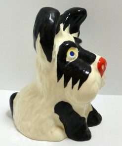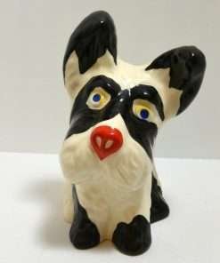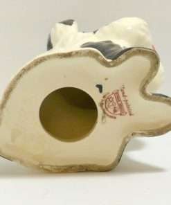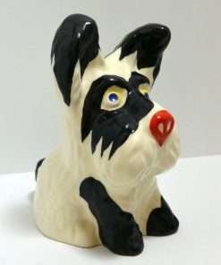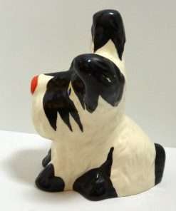 This hand painted Ditmar Urbach dog in black on white, with a touch of red, bright blue and yellow, is not only stunning, it is quite rare. It appears to be a unique cross between a Scottish Terrier and a West Highland Terrier, both being quite popular breeds during the 1920’s ” “ 1930’s. This figurine, also dating from the 1920’s to the 1930’s, is stamped “Handpainted Erphila Czechoslovakia”.
