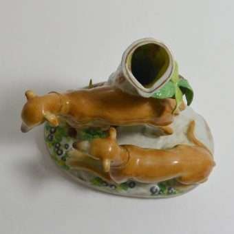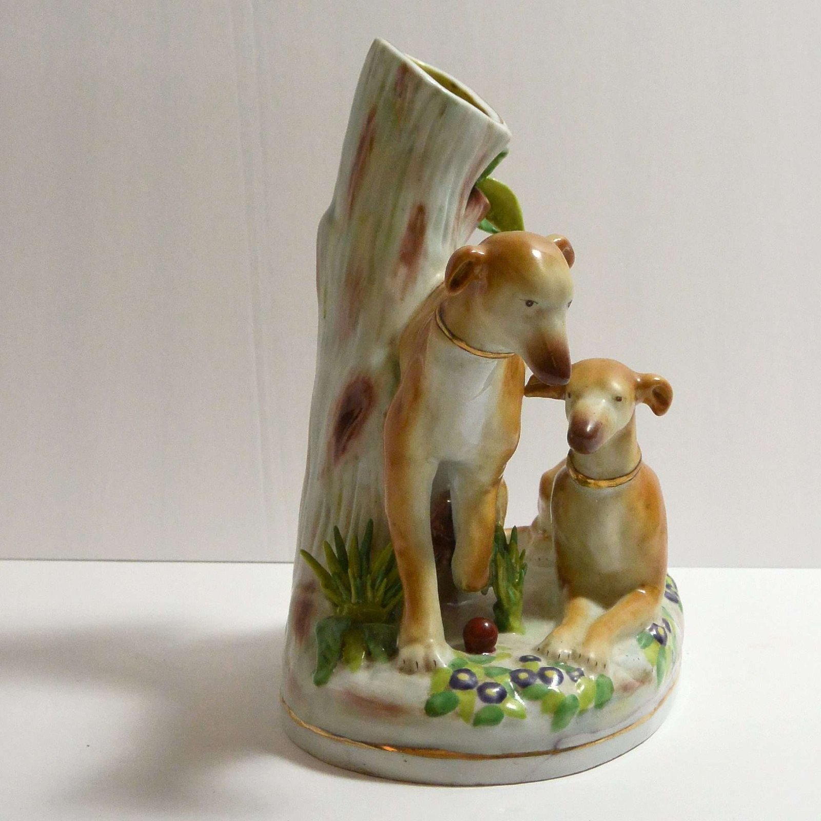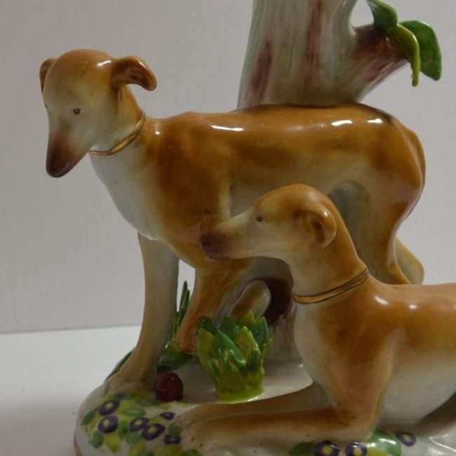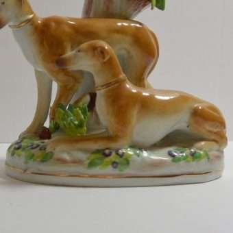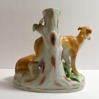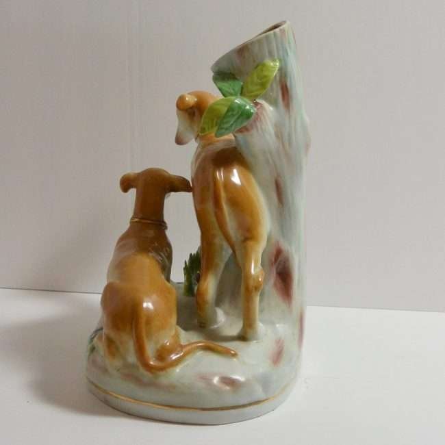This exquisite Staffordshire Spill Vase features one standing and one reclining Whippet or Greyhound dogs.