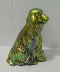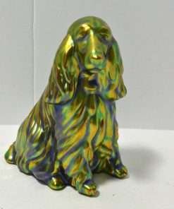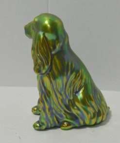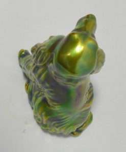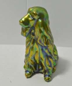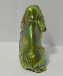 This gorgeous figurine of a Spaniel or Setter dog was created in the Zsolnay factory in Hungary. Its’ unique coloring, a mix of green blue and gold, was achieved by using eosin, which means “the light of the dawn” in Greek. Introduced in 1893, this process uses a glittering ceramic glaze to emphasize certain parts of the figurine with glimmer. This gives the piece an iridescent, metallic look, that has become the unique hallmark of Zsolnay porcelain, animal figurines.