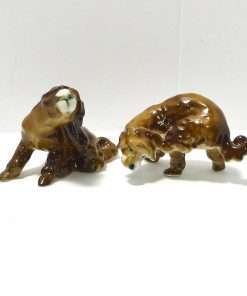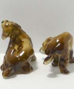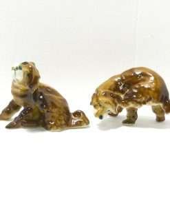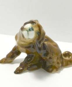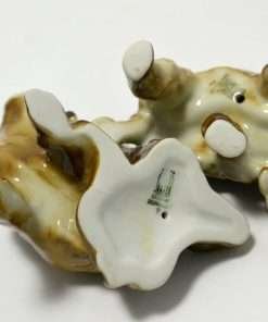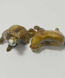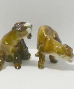 This Zsolnay pair of Spaniels are doing what dogs spend a great time doing…scratching behind their ears. One dog is doing it while standing and the other is sitting down to get the job done. Both are adorable. This is a very rare pair, made by Zsolnay of Hungary, a company that was established in 1868. They each have the Zsolnay 5 steeple backstamp, and they are both in excellent condition.