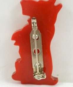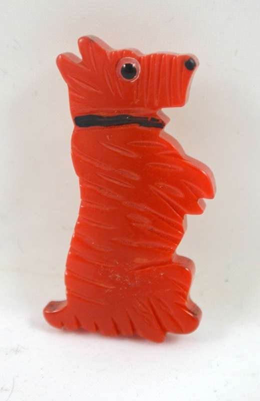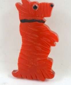 Small but sweet, this Bakelite Scottish Terrier is standing on his hind legs, just begging for your attention! He is a beautiful bright cherry red color with a shiny black painted collar, black nose and a glass eye. He stands a full 1 1/2″ tall and is 3/4″ wide. Deep scoring imitates his fur lines perfectly! A wonderful addition to your collection. A unique jewelry gift to your favorite dog-lover! Still time to buy him now and wear him for the holidays!