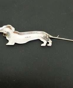 The beauty of this exquisite sterling silver Dachshund dog pin lies in both its realism, and its simplicity. At 2 3/4″ long x 1″ tall, it is a perfect size to add a touch of whimsy to any sweater, blouse or lapel. It is marked “sterling” on the underside, and the pin is in excellent working order.