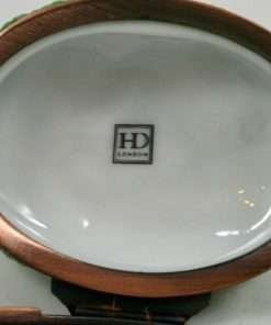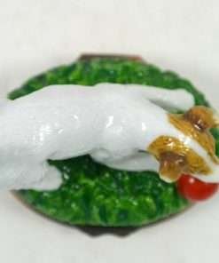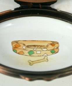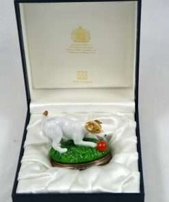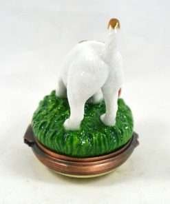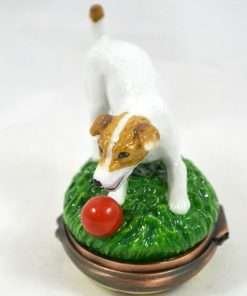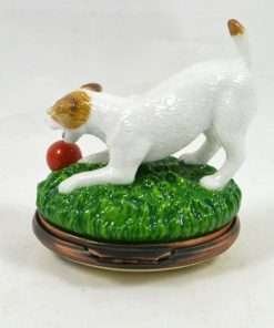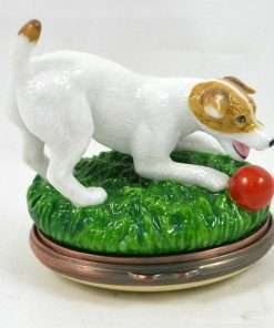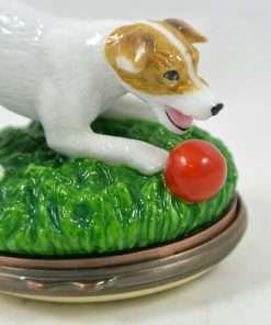 Everyone who knows a Jack Russell Terrier has experienced both its boundless affection, and its high-intensity energy. Beautifully designed, this hand-painted enamel box has completely captured the spirit of this wonderful dog. Perched on the top of the box, this delightful pup looks ready to grab the bright red ball and run. He stands 1 1/2″ tall x 2″ long x 1″ wide on top of a high gloss, mound of bright green “grass”. The hinged lid opens to reveal the Halcyon Days symbol on the top, and a detailed, pastel painting of the dog’s bed and bone in the bottom. Turn it over, and you will find a very realistic portrait of a Jack Russell Terrier, along with a brief history of the breed. The entire piece is in mint condition and measures 2 1/2″ tall x 2 1/4″ long x 1 1/2″ wide. For those who collect these bonbonnieres, or would like to start, this Jack Russell Terrier is one of the hard-to-find pieces. For a true Jack Russell Terrier lover, this little guy is guaranteed to steal your heart away!