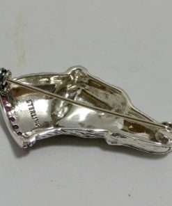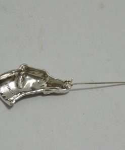 Exquisite in its detailing, this gorgeous Borzoi dog head pin is 925 sterling silver. The sleek appearance of the dog’s profile, combined with the “stepped” outline created by the abundance of flowing fur lines, gives it an Art Deco feel.