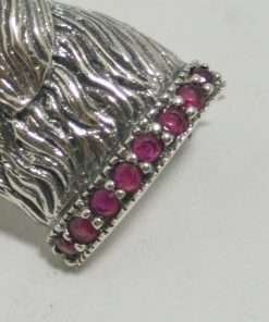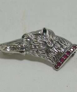 Add to that, this beautiful Borzoi is wearing an intricately detailed collar that is set with eight natural rubies. It measures 1 3/4″ long x 1″ tall, and it is in excellent, ready-to-wear condition.