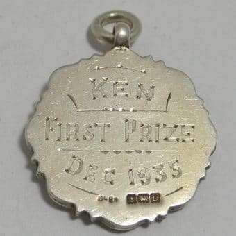 The hallmarks , also on the back, tell us that this solid, sterling silver, pendant or watch fob was made in Birmingham, England in 1928 by the Bendall Brothers.