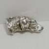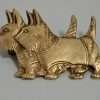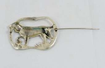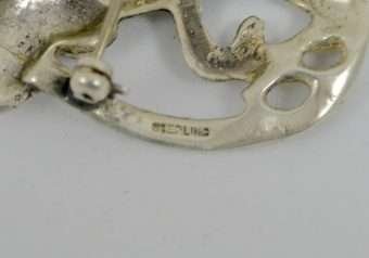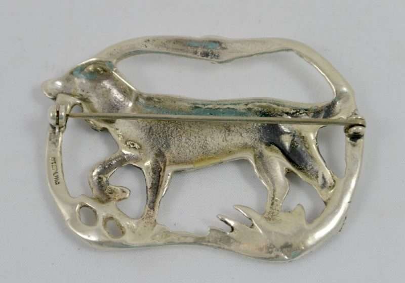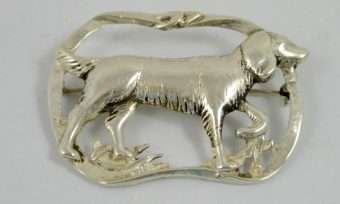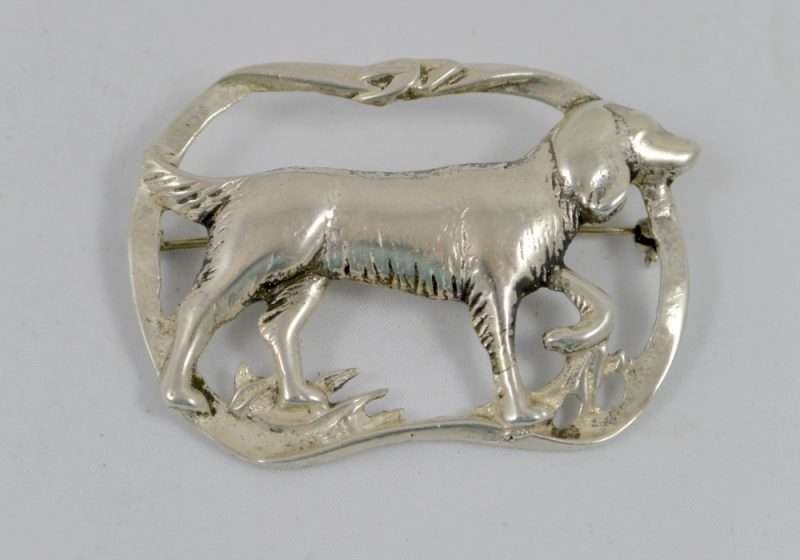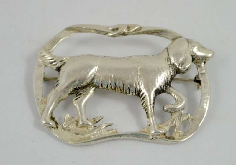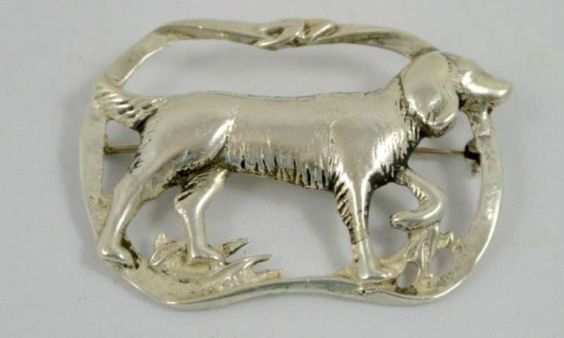 “Stunning” is the perfect word to use to describe this elegant, sterling silver brooch. Casual, but enormously elegant, it depicts a Setter Dog, poised gracefully, with one paw lifted, encircled in a flowing ribbon. It is perfectly sized at 2 1/4″ long x 1 3/4″ tall, to show off without being too heavy or overbearing. It is marked “Sterling” on the underside, and it is in excellent condition. What a gorgeous brooch to wear to show off your love of dogs. Also a gift you can’t beat for your favorite dog-loving friend!