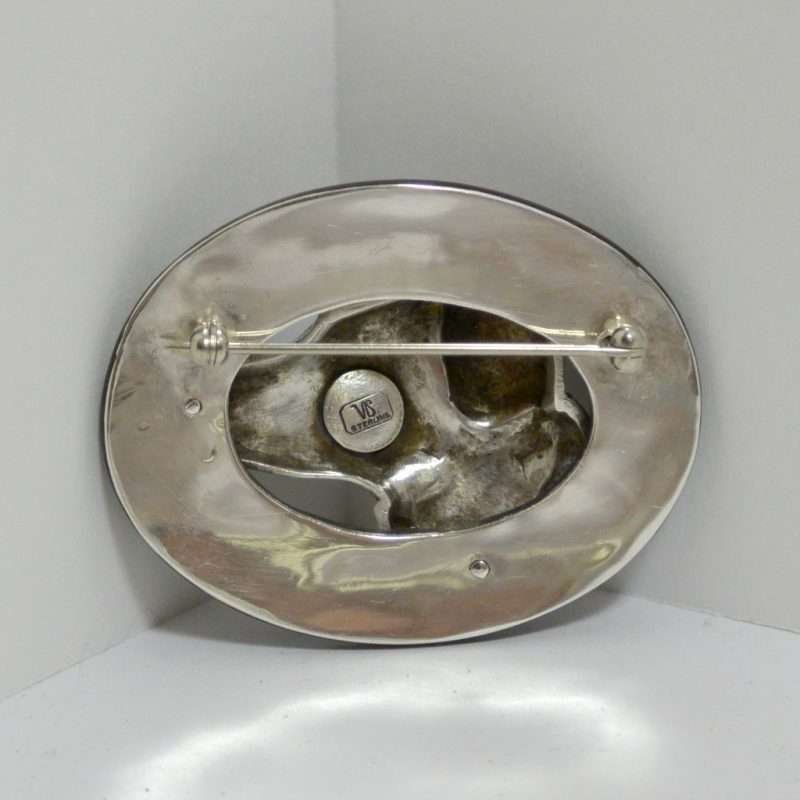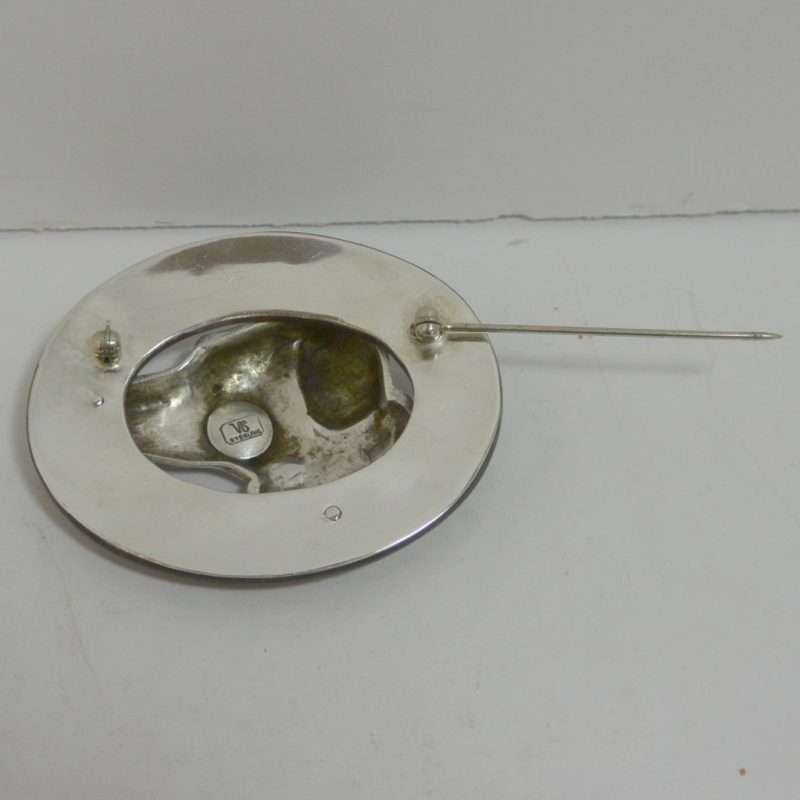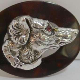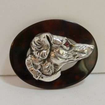This sterling silver Borzoi dog head brooch was handmade by Vincent Simone. The detailing is exquisite, with an abundance of fur lines, a buckle collar, and a two tone red and black eye. At 1 3/4″ tall x 2 1/4″ long, it is the perfect size to be worn as either a decorative pin or as a brooch to hold a garment together or a scarf in place. It is marked “sterling” and it is in excellent condition. If you are a Borzoi or Irish Wolfhound owner, this pin is a wonderful way to show off your favorite breed. If all dogs “speak” to you, this one would look gorgeous on a hand knit sweater or on a “houndstooth” jacket!