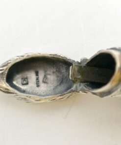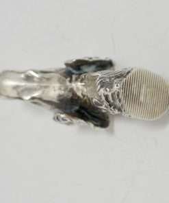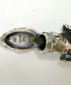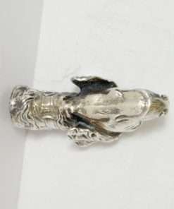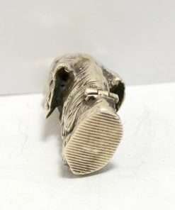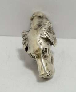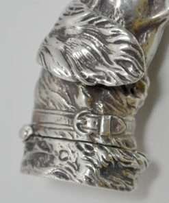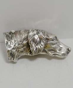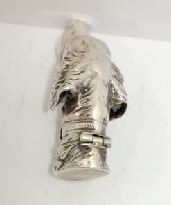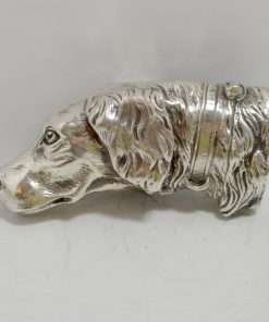 This sterling silver dog head vesta case is exquisite in every way. The detailing on this Retriever dog includes an abundance of fur lines, life-like eyes, nose and muzzle, and an intricately designed collar and buckle. It is also in excellent condition with a striker lid that opens well and snaps shut tightly. The maker’s letters “ES” are inside the flip lid. Measuring 2″ long x 1″ tall x 1/4″ wide, it weighs in at 44.1 grams of sterling silver. If you are a collector of vesta cases, this gorgeous dog would be an extraordinary addition to your collection. For a dog lover, this beautiful work of canine art would be a gift to treasure forever!