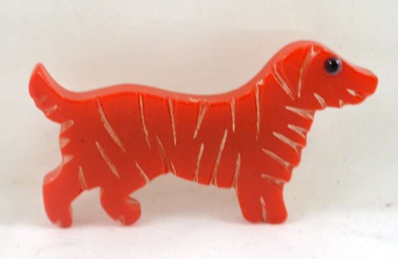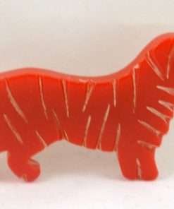 Small but sweet, this unusual-to-find, Bakelite Terrier pup is standing alert and just begging for a walk! He is a beautiful, bright cherry red color with a glass eye. He stands a full 1″ tall and is 2″ long. Deep scoring imitates his fur lines perfectly! A wonderful addition to your collection. A unique jewelry gift to your favorite dog-lover!