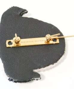 Created by Mignonne Gavigan, it is done with hand-crafted thread embroidery, and micro bugle beads. It has a black leather backing, and a classic rhodium- plated brass pin on the back with the maker’s mark across the bar.