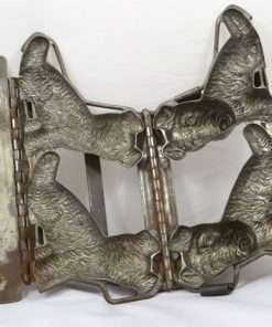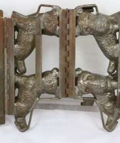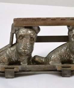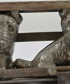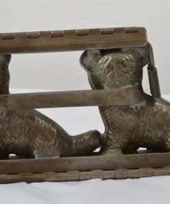 This twin Scottie mold is highly detailed, showing “shaggy” fur lines, as well as detailed eyes, noses and even smiles!It is a rare and wonderful antique mold for collectors, and a unique and charming decorative piece for your kitchen. It has the original clamps, and it is in good working condition. We are leaving it “as is” to maintain its antique patina. It would also shine up nicely, if that is what you would prefer to do.
