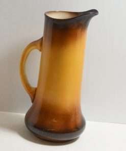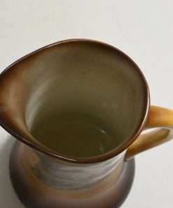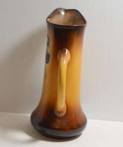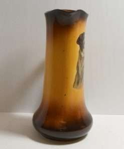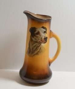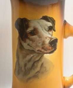 This large, antique pitcher was designed and manufactured by the Taylor Smith & Taylor Pottery Company of Chester, West Virginia between 1908 – 1915. Warm gold and brown tones provide the background for a highly detailed portrait of a dog.