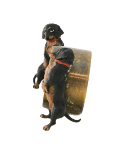 This Austrian bronze napkin ring features two cold-painted dachshunds, each appearing to hold up their side of the heavy ring.
