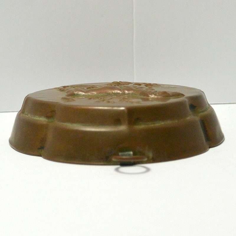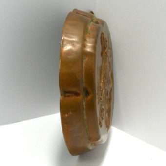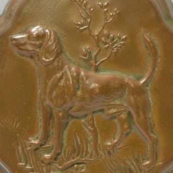 This unique, vintage butter mold is copper on the front and zinc lined. Measuring 5″ tall x 4″ wide, it features a wonderful, raised, full body portrait of a Sporting Dog, perhaps either a Retriever, or a Pointer. It has a round loop at the top for hanging, ad it is in excellent, vintage condition. We have left it unpolished because we think it looks wonderful as it is.