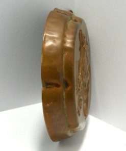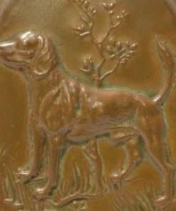 This unique, vintage butter mold is copper on the front and zinc lined. Measuring 5″ tall x 4″ wide, it features a wonderful, raised, full body portrait of a Sporting Dog, perhaps either a Retriever, or a Pointer. It has a round loop at the top for hanging, ad it is in excellent, vintage condition. We have left it unpolished because we think it looks wonderful as it is.