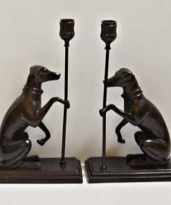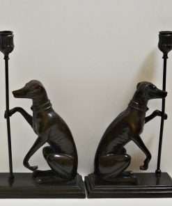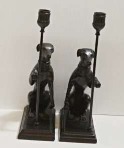 This pair features Greyhound/Whippet dogs, seated on a rectangular base, and holding a thin pole with a candle holder at the top.
