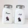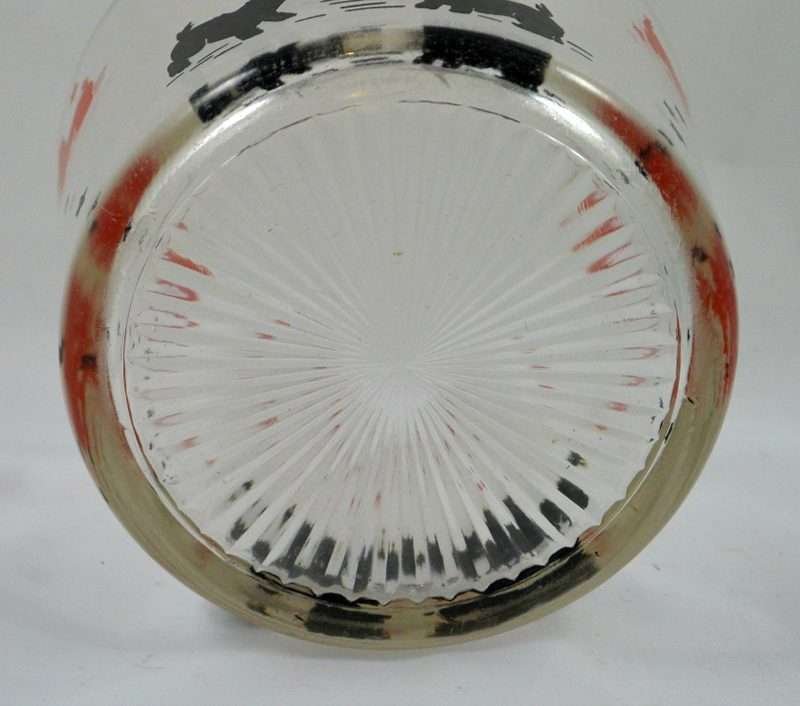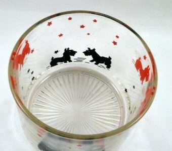 We could come up with dozens of uses for this vintage Scottie glass bowl. Originally, it was designed to be used as an ice tub, to coordinate with the many Scottie Terrier-themed glassware items manufactured by the Barlett-Collins Glass Company of Sapulpa, Oklahoma during the 1940’s. This one is quite heavy in weight and has a line of red Scotties along the top, interspersed with red stars, and a similar pattern of black Scotties along the bottom, interspersed with black stars. It is in excellent condition, and a wonderful way to add some whimsy to your bar area or put to practical use in your kitchen to hold fruit, nuts or a salad-for-two! It is 4″ deep, with a diameter of 5 1/2″. It is a hard-to-find addition to a Scottie glass collection, and of course it would make the perfect gift to any dog or Scottish Terrier lover.