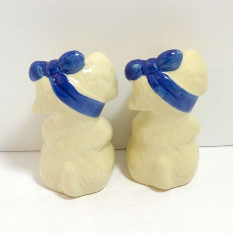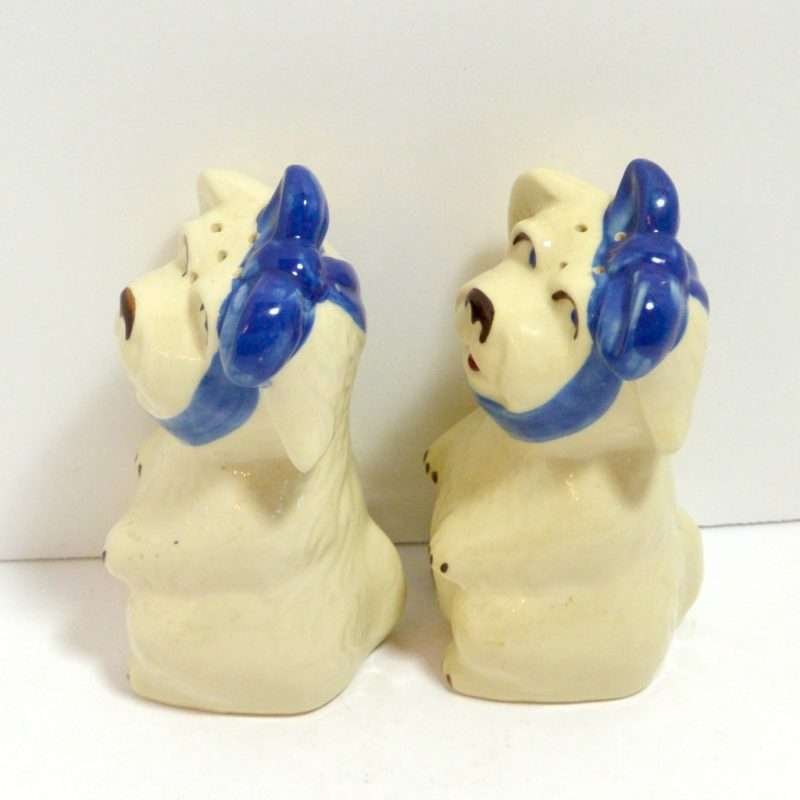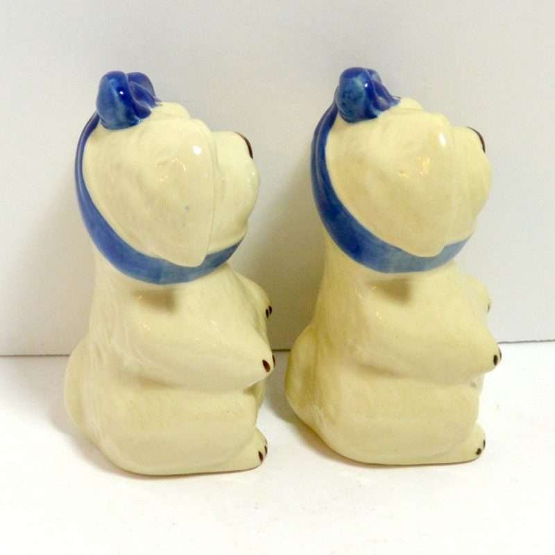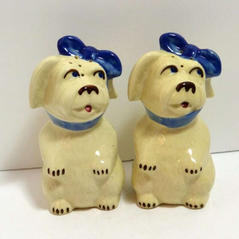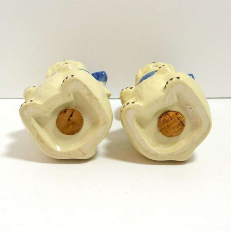 Here we have the ever-popular “Mugsy, The Toothache Dog”, large salt & pepper shakers. Standing a full 5″ tall x 3″ long x 2 1/2″ wide, this pair is in excellent condition with their original corks. Manufactured by The Shawnee Pottery Company of Zanesville, Ohio, they have their signature, cobalt blue, ribbon bandage, wrapped under their chins and tied in a bow on top of their heads. This whimsical pair can’t help but make you smile! Made in the USA, they are highly collectible and so much fun to own.