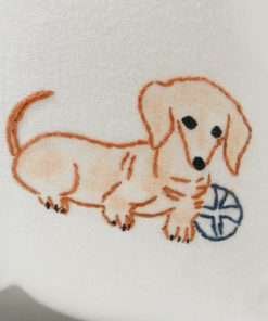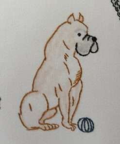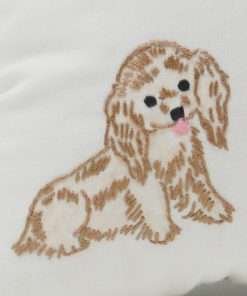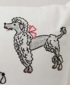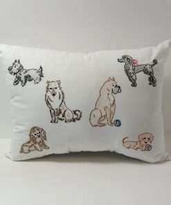“Snips and snails, and puppy dogs tails; That’s what little boys are made of.” This wonderful pillow brings that old nursery rhyme alive with six different dogs embroidered on bright white cotton.