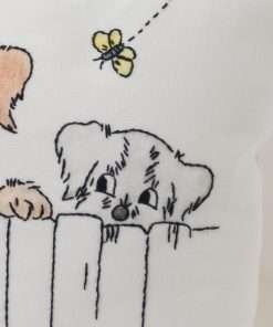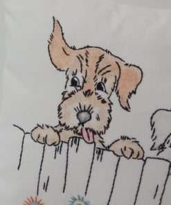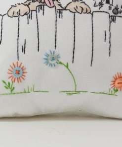 This wonderful pillow features two adorable puppies peering over the top of a picket fence.