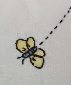 The pillow is also embellished with a Friendly” bubmble bee and a few posies with white, baby pink, and baby blue button centers.