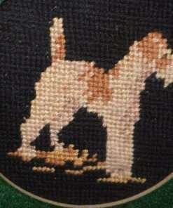 This wonderful needlepoint shows a handsome Wire Haired Fox Terrier dog standing, alert and ready to go. Done in wool yarn, on a black background, which sets off his soft beige and caramel coloring.