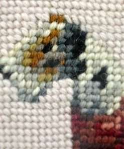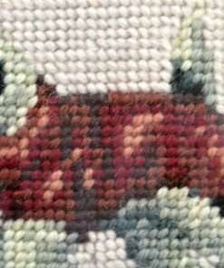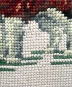 Classic, beautiful, and absolutely flawless! This wonderful needlepoint shows a handsome Wire-Haired Fox Terrier standing, alert and ready to go, wearing a burgundy sweater. Done in wool yarn, on a warm beige background, in shades of pale grey, dark grey, caramel and black, the needlepoint is matted in a soft moss green, covered in glass, and framed in a “distressed”gold frame. The needlepoint is flawless and beautifully done. It measures 9″ x 9″. The matte is in excellent condition as well. The frame is in great condition, but only three side edges are painted gold and the top side is painted black, and that side has some surface scratches on it. It cannot be seen unless you look down on it from the top. The entire piece, with the frame measures 14 1/4″ x 14 1/4”. This framed work-of-art would look fabulous in a study or office. It would also add interest and “texture” to a canine gallery of prints and paintings.