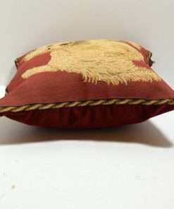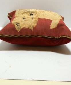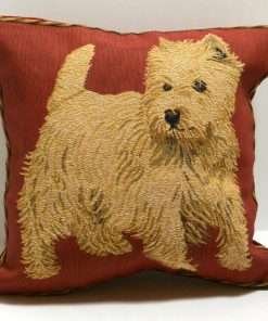 This gorgeous, pillow features a beautifully detailed portrait of a West Highland Terrier dog. It is a full body portrait of the dog, printed on the fabric and then masterfully embellished with petit point hand stitching.