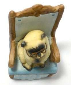 This wonderful, ceramic Pug dog is seated on a throne-like chair, wearing eye glasses. Measuring 6 1/2″ tall x 3″ long x 2 1/2″ wide, he is in excellent condition.