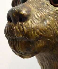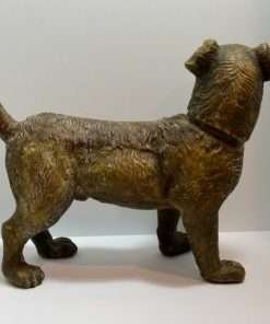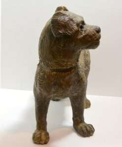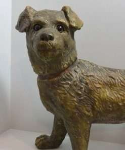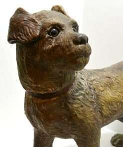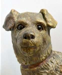 This exquisite terracotta Terrier dog was created in the Friedrich Goldschneider Factory between 1890-1900. This is a very large dog, standing proudly at 14 1/4″ tall x 17 1/2″ long x 8″ wide.