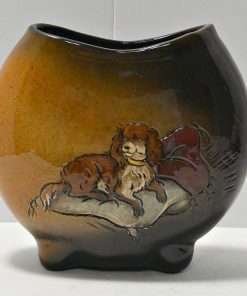 This unique, pillow vase was created by Rick Wisecarver in 1983. Unlike most of his pottery pieces that feature Native American Indians, this wonderful vase, while done in his signature brown and tan glaze, features a hand painted Cavalier King Charles Spaniel .