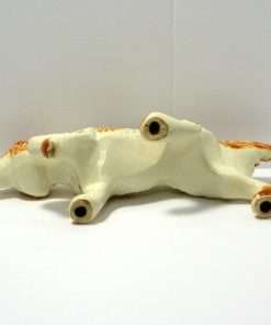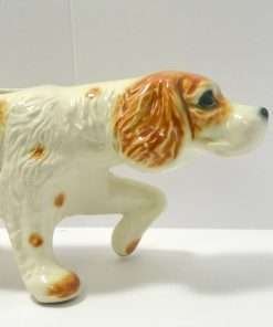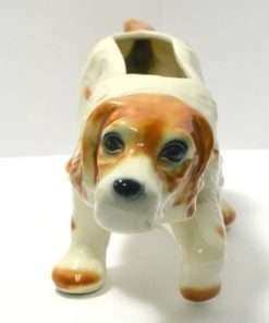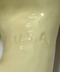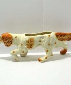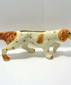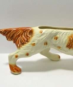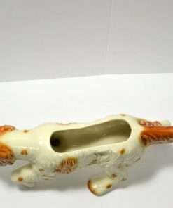This large, vintage planter is in excellent condition. Measuring a full 16″ long x 5 1/4″ tall x 5 3/4″ wide, it is a hunting dog poised with it’s tail extended, nose to the ground, and one paw up. It has a beautiful bright caramel and white coloring with lots of fur lines and wonderful dark, deep set eyes. It is well-marked with the incised model # 280-D, and USA on the inside of one leg.