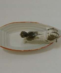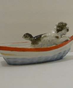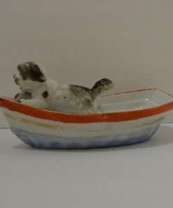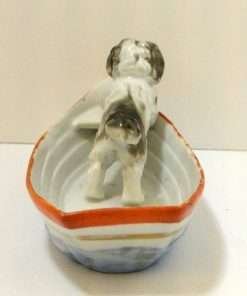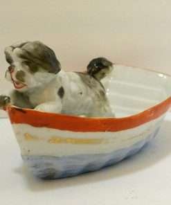 This Conte & Boehme, porcelain, trinket dish is in the shape of an adorable dog in a rowboat. Called a “fairing”, they were quite popular between 1860 – 1914, where they were given away as prizes at country fairs throughout England.