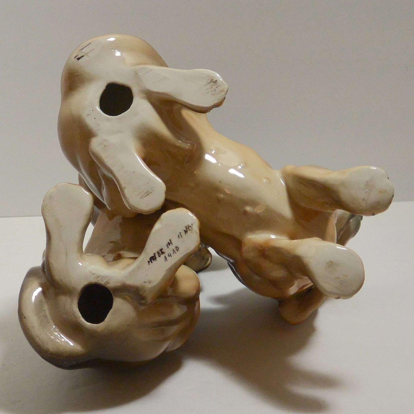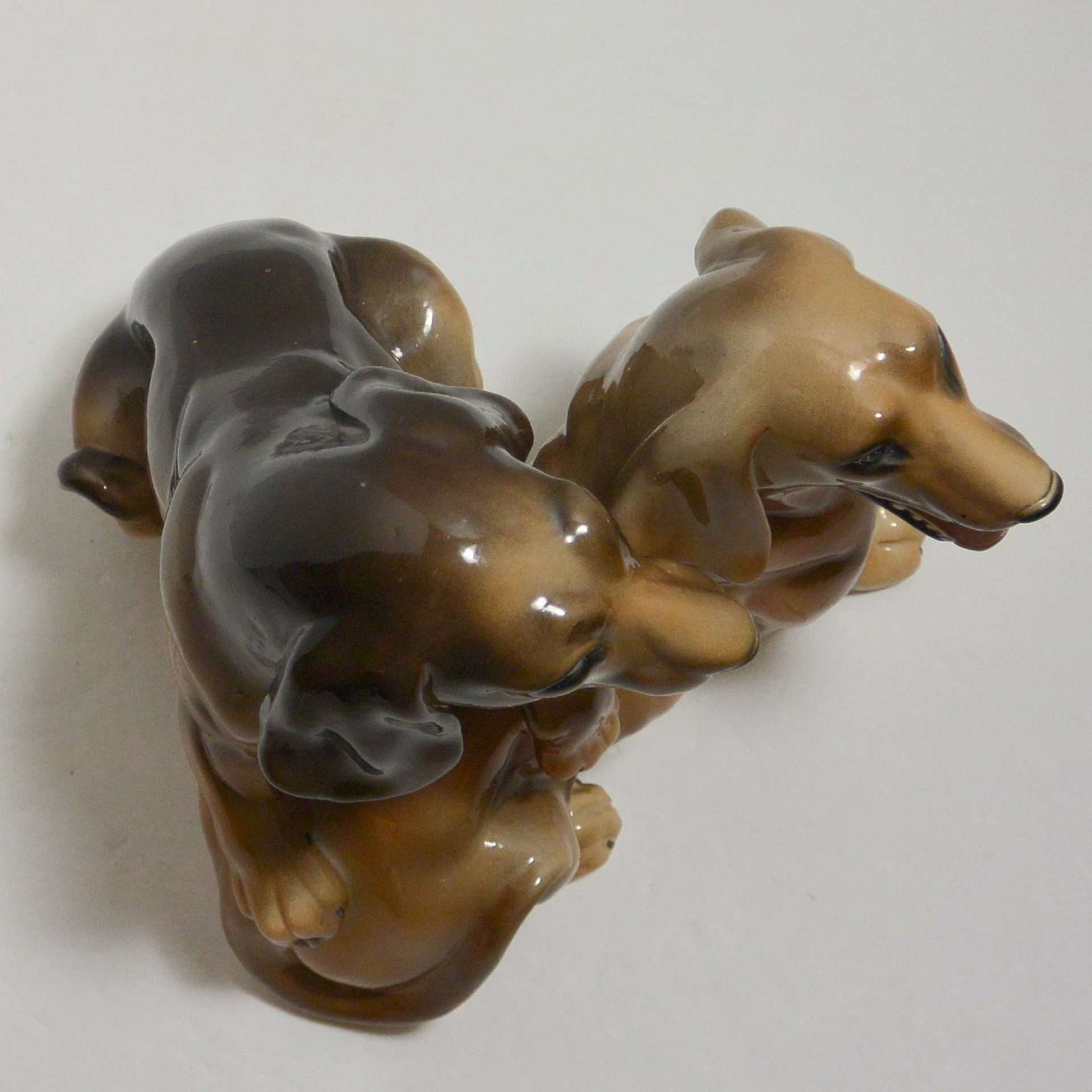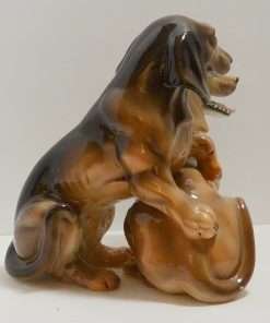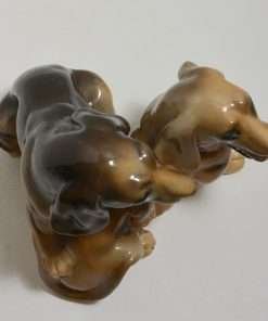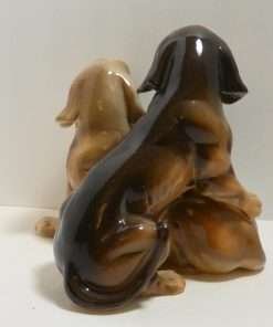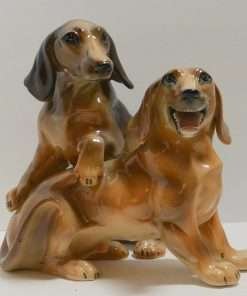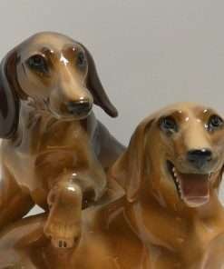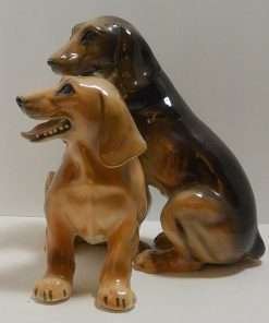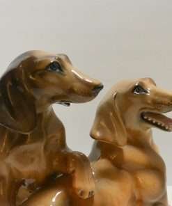 This wonderful large, hand painted ceramic figurine depicts a pair of lively, short-haired Dachshund dogs.
