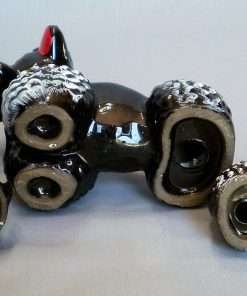 This sweet trio of poodles are black with hand-painted red and white detailing, with a touch of lime green and yellow around their eyes. There are no makers marks and therefore we will venture a guess that they date between 1950-1960. The Mother Poodle is 5″ tall, 5″ long and 2.5″ wide. Her standing pup is 3″ tall, 2.75″ long and 1.5″ wide. Her sitting pup is 3.25″ tall, 3″ long and 1.5″ wide. They are in excellent condition without any chips, cracks or visible wear or repair. These poodles would add “oodles” of charm to any collection.