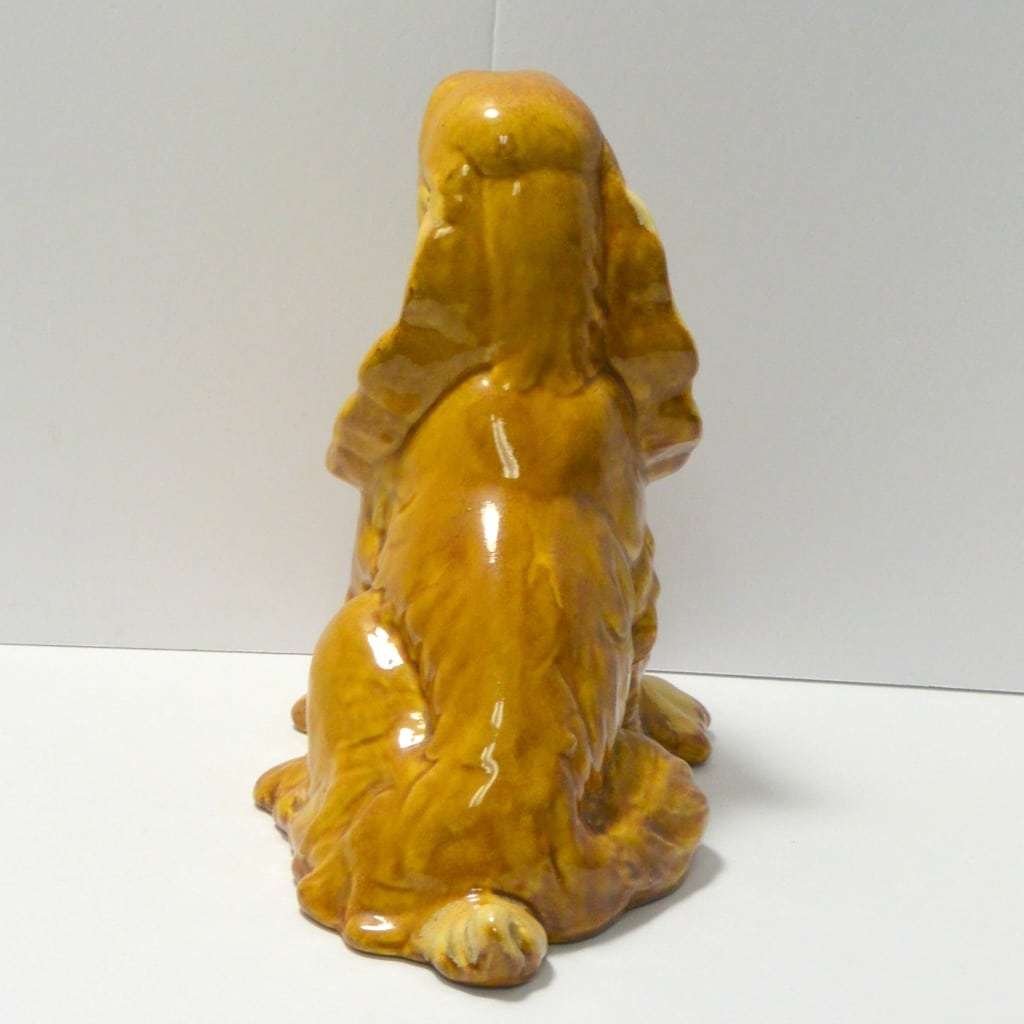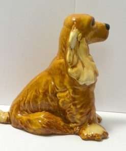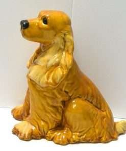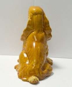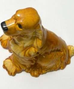 This totally charming, vintage Cocker Spaniel was created by Royal Arden Hickman (1893-1969) for the then called “Royal Haeger” brand of the Haeger Company of Dundee, Illinois. Measuring a full 9″ tall x 8 1/2″ long x 6 1/4″ wide, she is in excellent condition. She has a beautiful high gloss glaze, and is painted in a gorgeous mix of golden tan, soft brown and caramel tones.