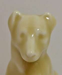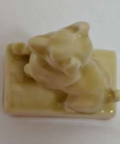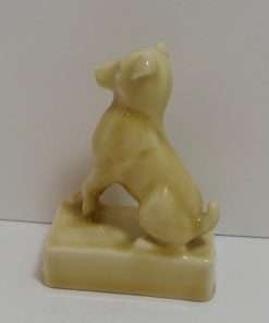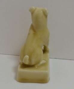 This Rookwood Pottery Terrier pup is just as sweet as his butterscotch glaze. With one paw up and his head held high and alert, he is 5″ tall x 3 1/2″ long by 2 1/4″ wide (which includes the rectangular base he is sitting on.) He is in excellent condition, with a high degree of sharp mold detail, and a beautiful, glossy finish. The based is marked with the Rookwood symbol as well as the model #2777. This delightful pup will make a perfect addition to a Rookwood Pottery collection, or a beautiful tribute to that special Terrier in your life!