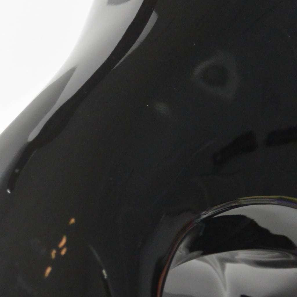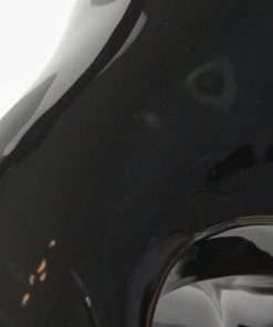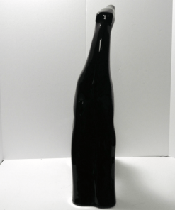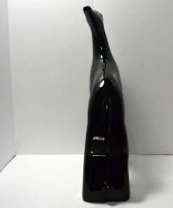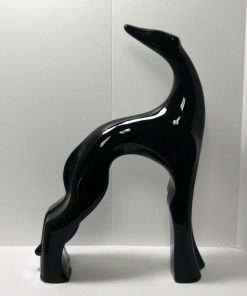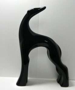 It is in excellent condition and stands a full 22″ tall x 14″ long x 5 1/2” wide. It is done in a very high gloss, deep, ebony black. The white spots that you see are caused by the camera flash. It does have a line of very tiny gold lines on it’s back that are very difficult to spot. We have magnified them in the last picture. They do not detract from the streamlined beauty of this wonderful dog.