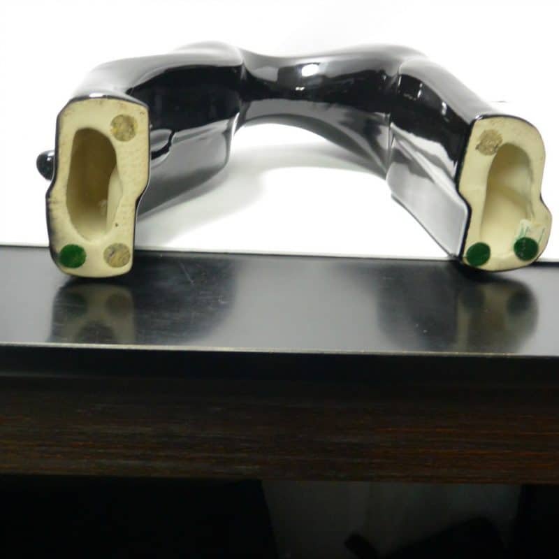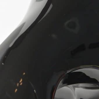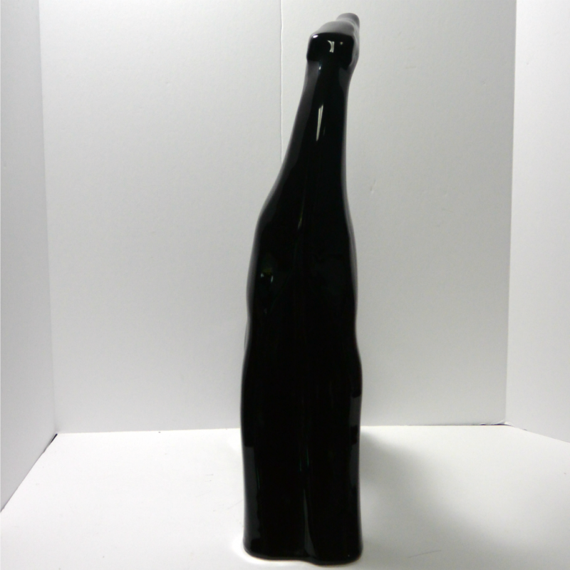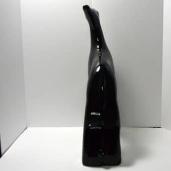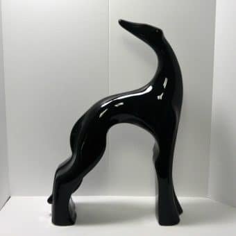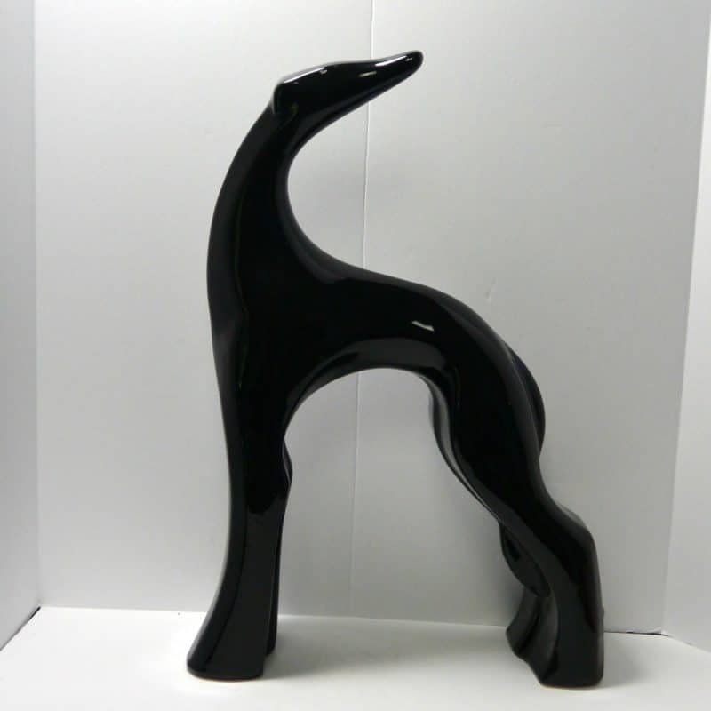 This classic sculpture is a stunningly simple, but elegant portrayal of a Greyhound dog. It was made in America by Royal Haeger, and it is has its original label, which states that it was “American made, copyright 1992. It is in excellent condition and stands a full 22″ tall x 14″ long x 5 1/2” wide. It is done in a very high gloss, deep, ebony black. The white spots that you see are caused by the camera flash. It does have a line of very tiny gold lines on it’s back that are very difficult to spot. We have magnified them in the last picture. They do not detract from the streamlined beauty of this wonderful dog.