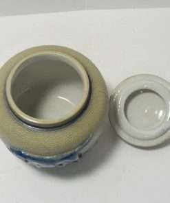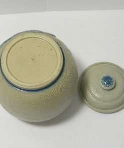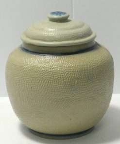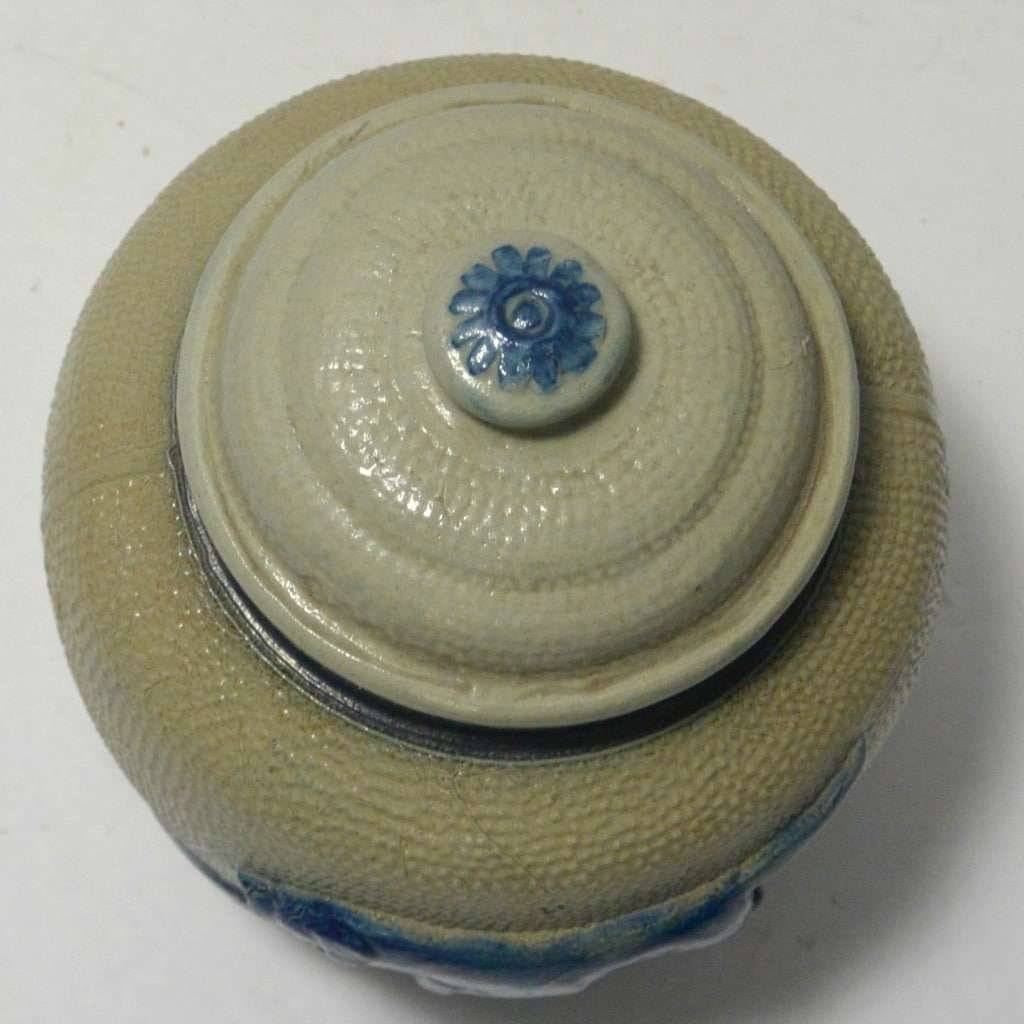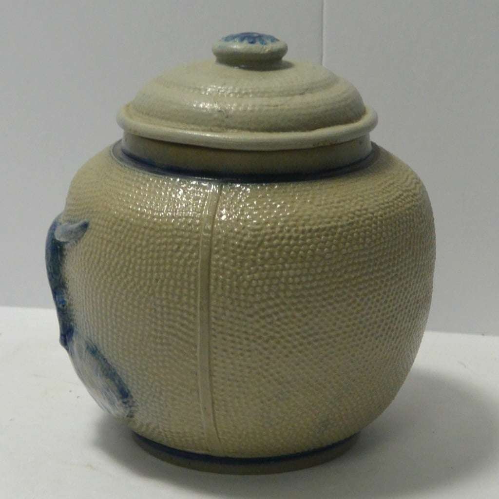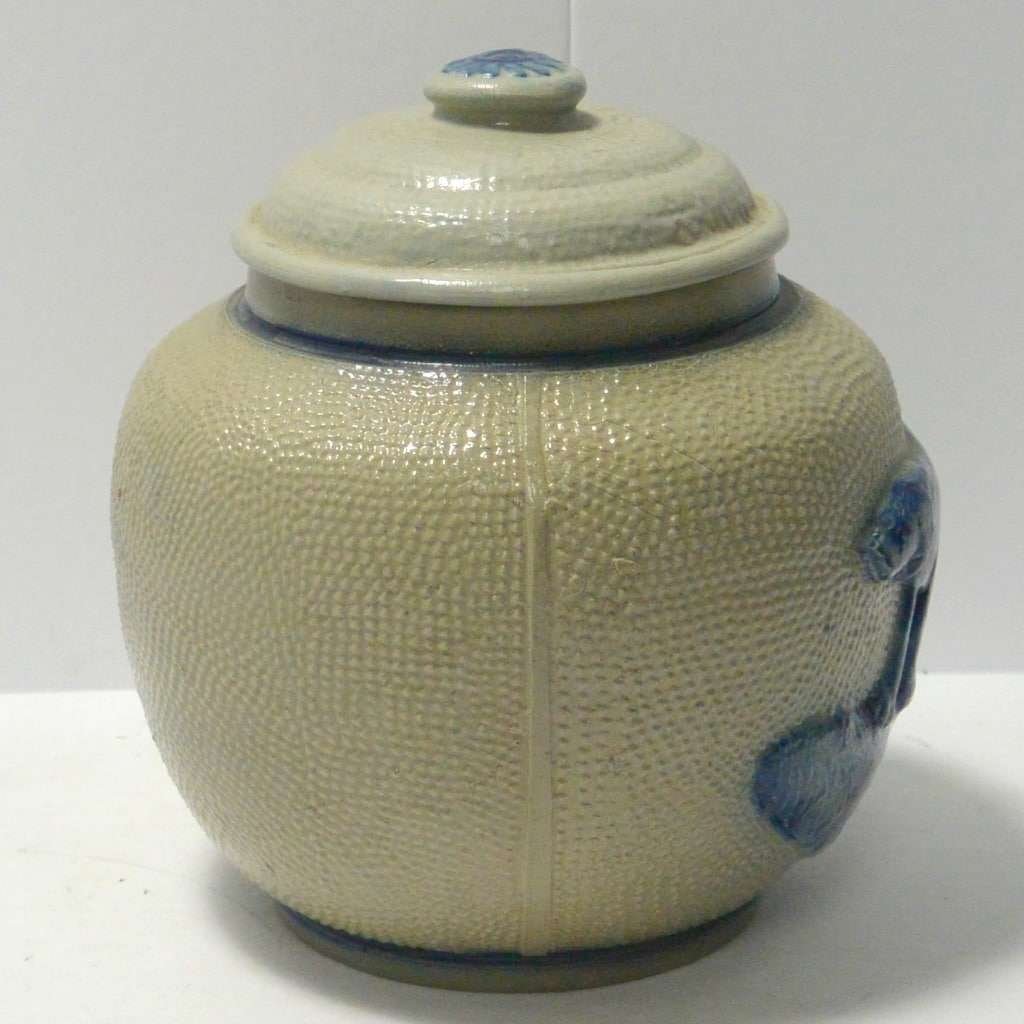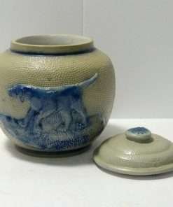 Rare and so charming, this Salt Glazed Pottery Jar is embellished with a Retriever dog, sporting a fancy collar. It measures 6 1/2″ tall x 5 3/4″ in diameter. This wonderful jar is stoneware with a glossy, translucent glaze that also has a slightly orange-peel-like texture. This process of “salt glazing” began in Germany in the 1400’s and became popular in England and colonial America in the 1700’s. It was done by throwing common salt into the kiln during the firing process. The colorless glaze could be colored brown by adding iron oxide, purple, by adding manganese oxide, or in this case, blue, by adding cobalt oxide. Salt glazing was forced to cease in 1983, due to environmental restrictions.